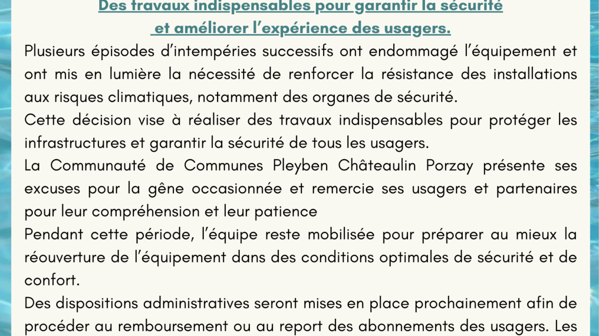 INFORMATION – FERMETURE TEMPORAIRE Le centre aquatique Les Bassins de l’Aulne sera fermé temporairement à compter du lundi 26 janvier 2026, pour une durée de quelques semaines. Cette fermeture est…